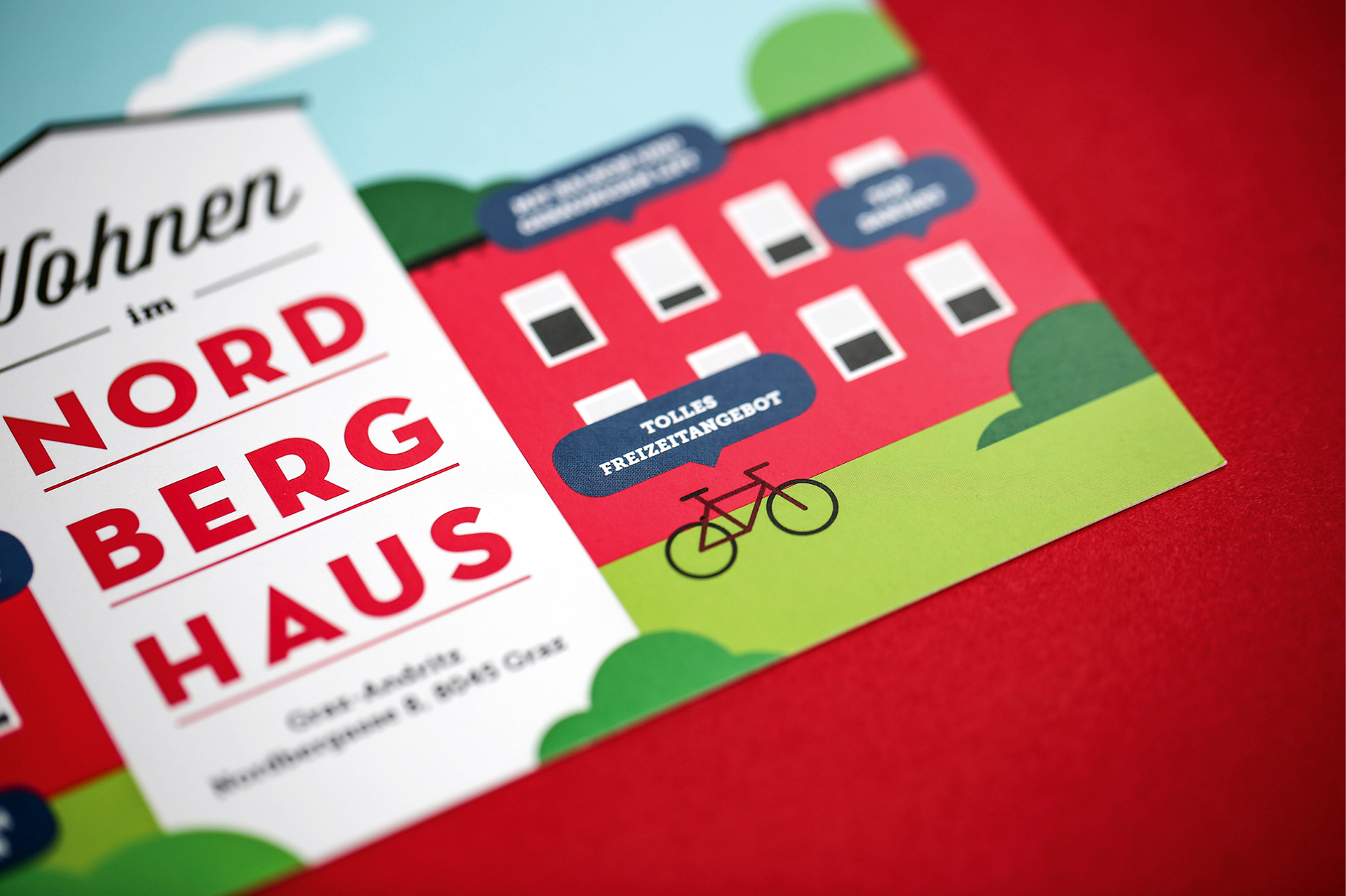 Eine coole Location zum Leben! Das Nordberghaus in Graz-Andritz, mitten in der Natur. Benannt nach Dr. Wilhelm (Willi) Nordberg, Direktor für Weltraumanwendung bei der NASA soll es vor allem die junge Zielgruppe ansprechen, die preiswert leben, aber trotzdem nicht auf gute Verkehrsanbindung und tolle Freizeitmöglichkeiten verzichten möchte. Eine Illustration auf der Rückseite des Flyers transportiert alle Vorteile des Wohnhauses, die knallige, kontrastierende Farbpalette garantiert die nötige Aufmerksamkeit.