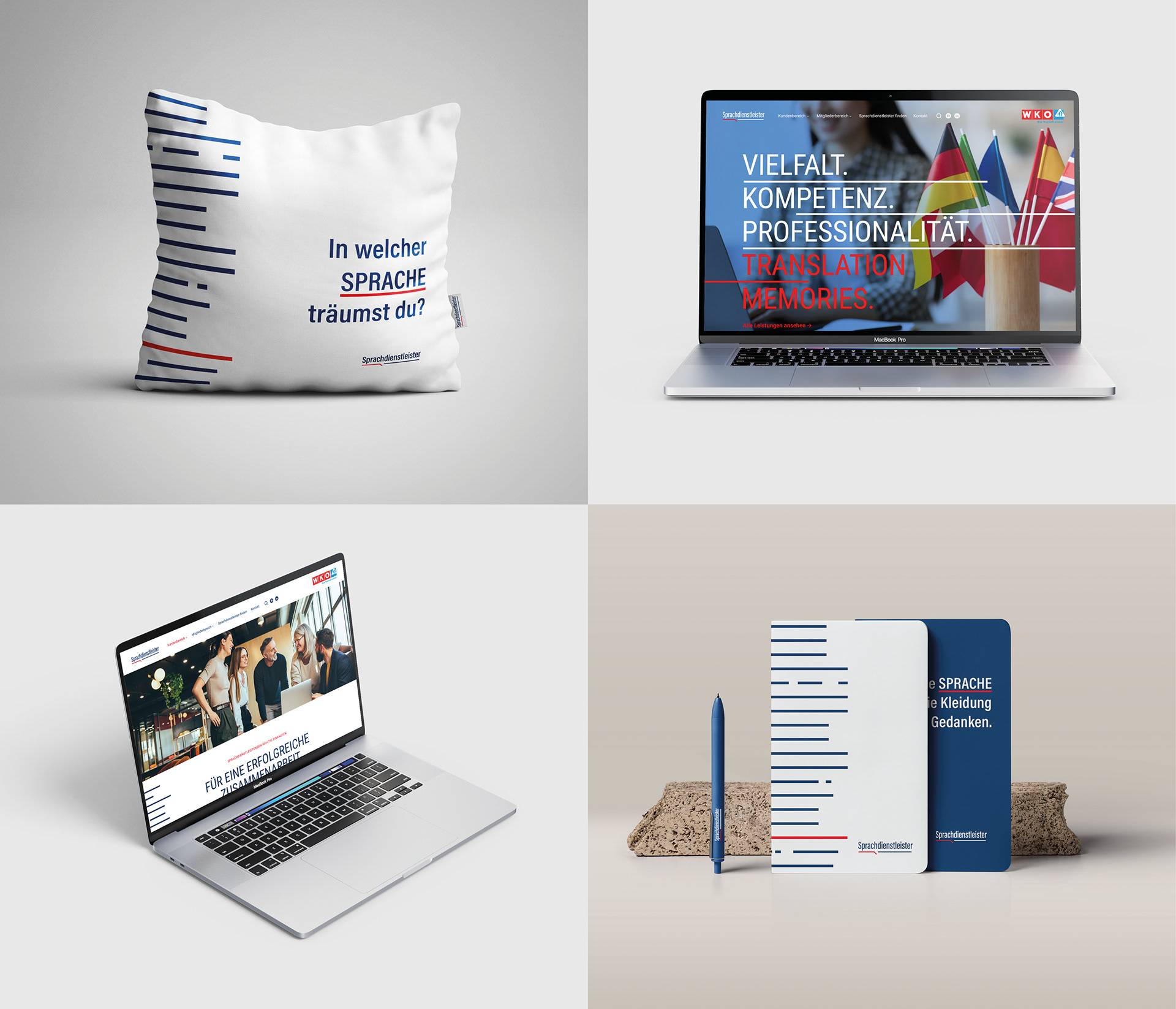 Für die Berufsgruppe der Sprachdienstleister der WKO wurden wir für die Gestaltung eines Logos und die Umsetzung einer neuen Website beauftragt. Die Linie als Symbol für gesprochene und geschriebene Sprache zieht sich als Gestaltungselement durch das gesamte Branding.